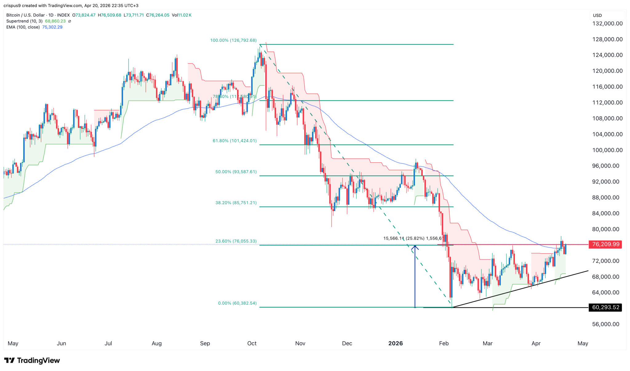 Das Tageschart zeigt, dass der BTC-Kurs von einem Tiefststand von 60.000 $ im Februar auf heute 75.500 $ gestiegen ist. Bei genauerer Betrachtung zeigt sich, dass das digitale Gold den 50-Tage-Exponential Moving Average (EMA) bereits von einer Unterstützungslinie in einen Widerstand verwandelt hat. Außerdem versucht er, über den 100-Tage-Gleitenden Durchschnitt zu steigen, der mit dem 23,6 %-Fibonacci-Retracement-Level zusammenfällt.