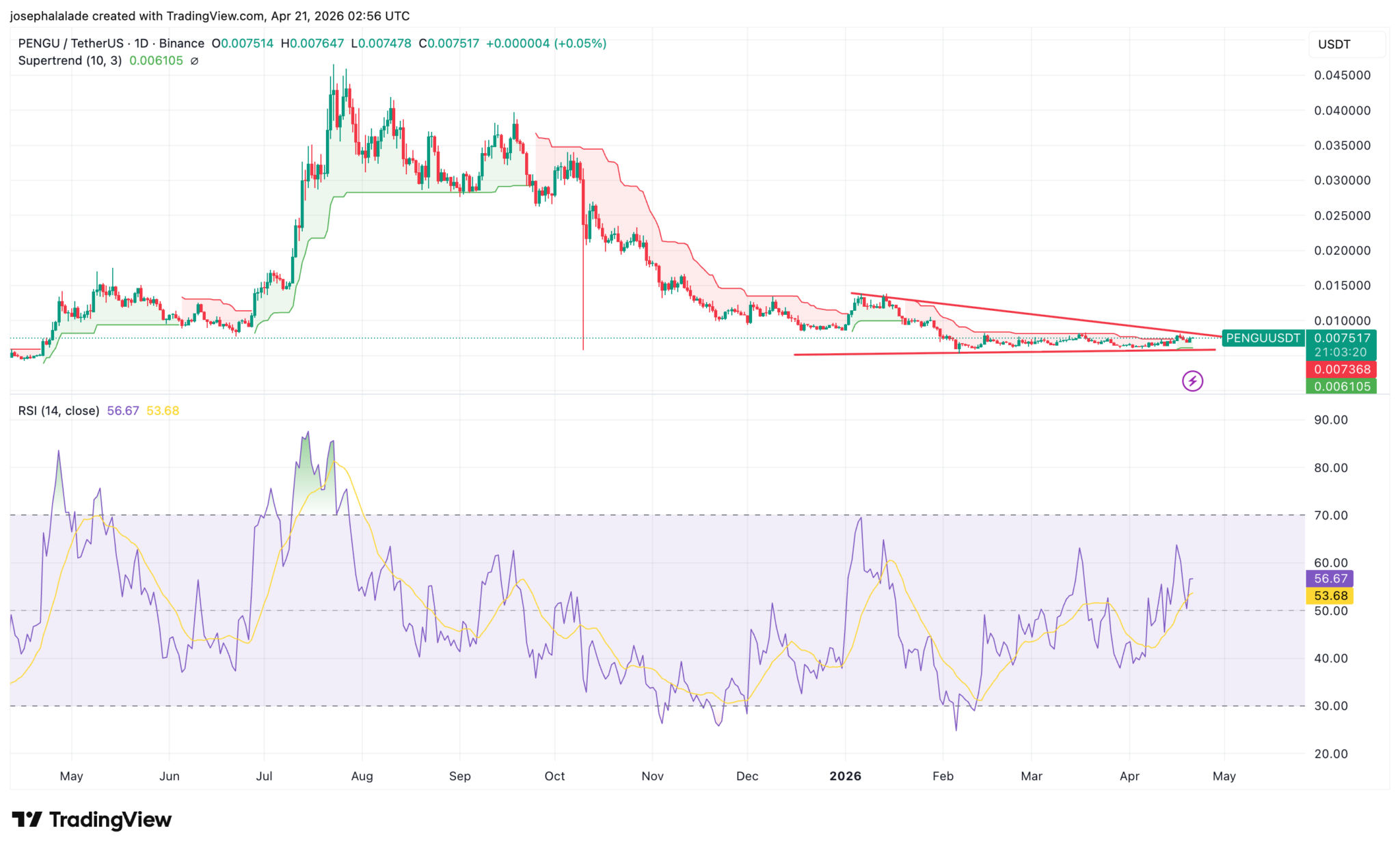 Daten zeigen jedoch, dass der RSI bei 56,67 – mit einer Signallinie bei 53,68 – seit seinem Tiefpunkt bei 28–30 Anfang 2026 höhere Tiefststände verzeichnet, während der PENGU-Coin-Kurs weiterhin tiefere Tiefststände erreichte. Diese Divergenz ist derzeit das glaubwürdigste Signal auf dem Tageschart.