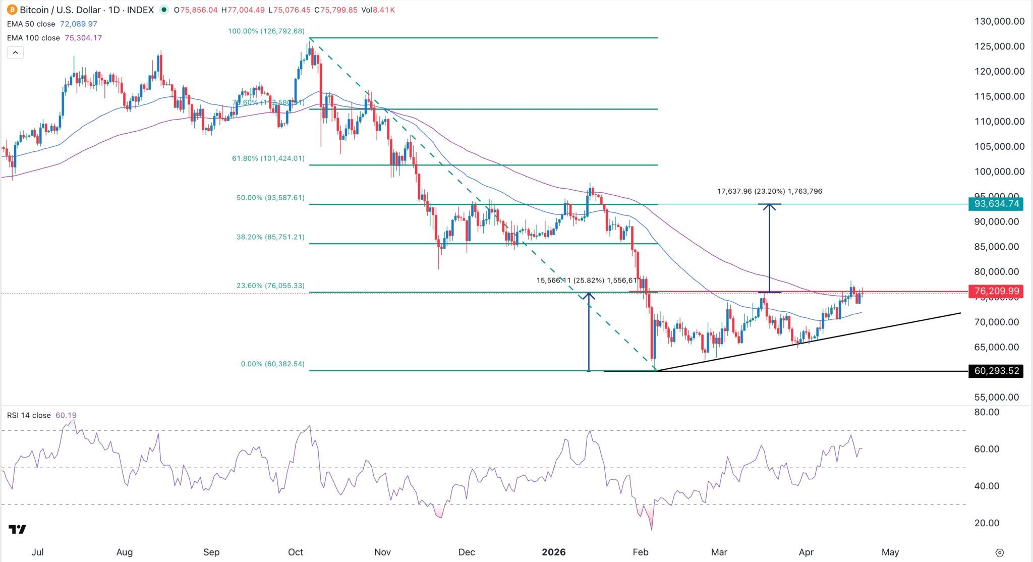 Der Tageschart zeigt, dass sich der BTC-Kurs in den letzten Monaten erholt hat. Er ist von einem Tiefstand von 60.000 $ im Februar auf derzeit 75.730 $ gestiegen.