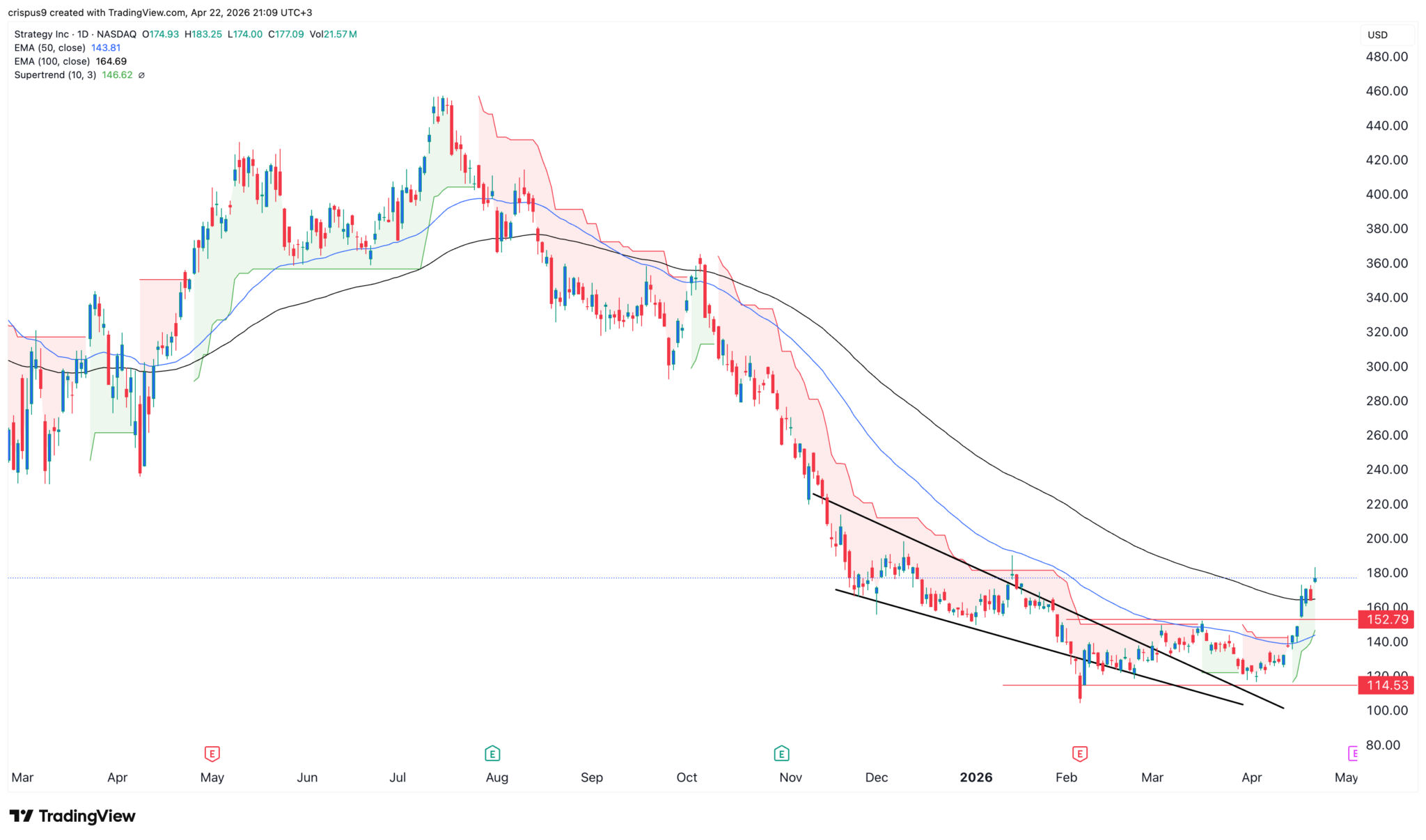 Die Strategy-Aktie bildete zudem ein Doppelboden-Muster bei 114,53 $ und eine Nackenlinie bei 152 $. Außerdem ist der Supertrend-Indikator gerade bullisch geworden, während die Aktie über den 50-Tage- und 100-Tage-Exponential Moving Averages (EMA) gestiegen ist.