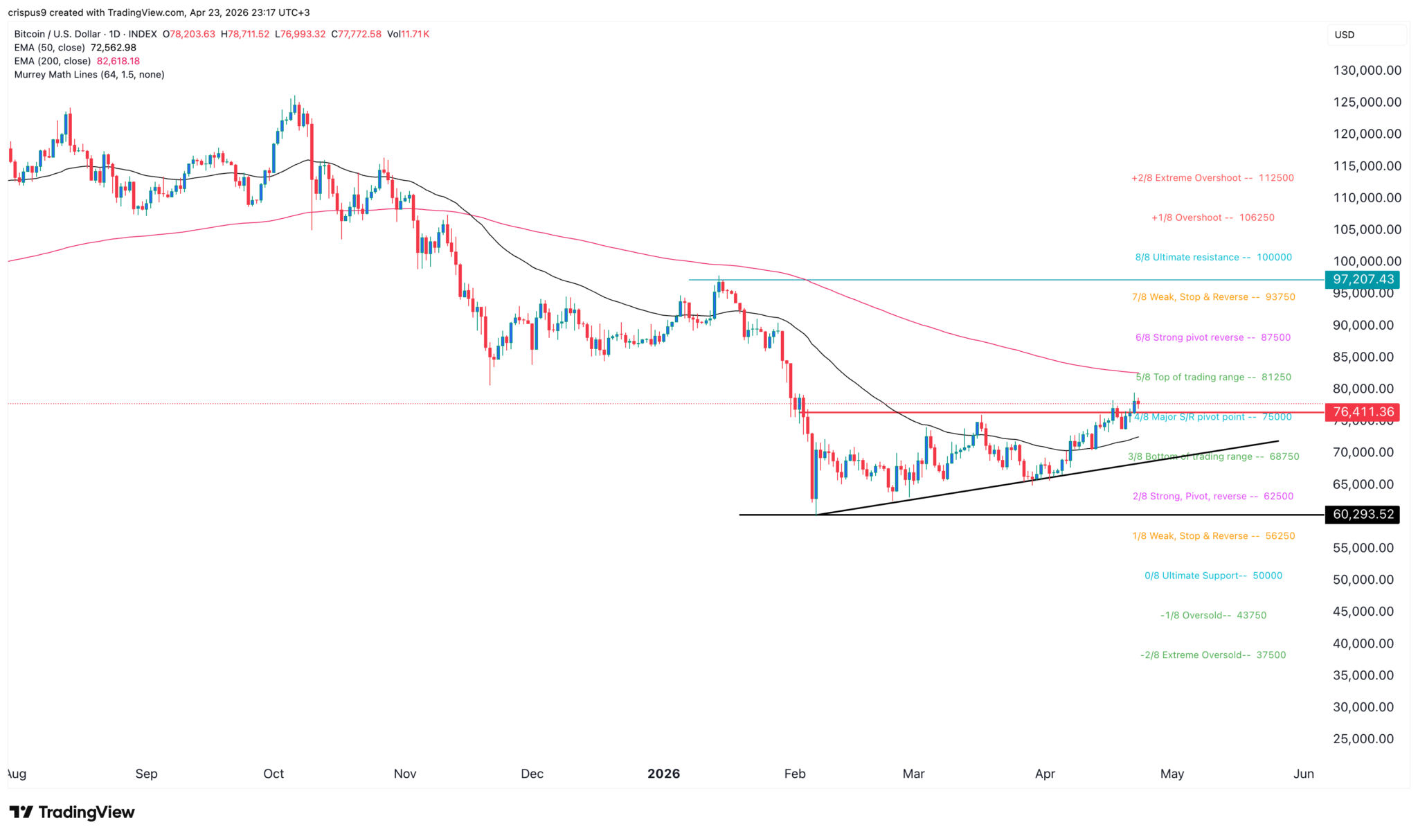 BTC hat das wichtige Widerstandsniveau bei 76.410 $ überschritten, seinem Höchststand im März dieses Jahres.