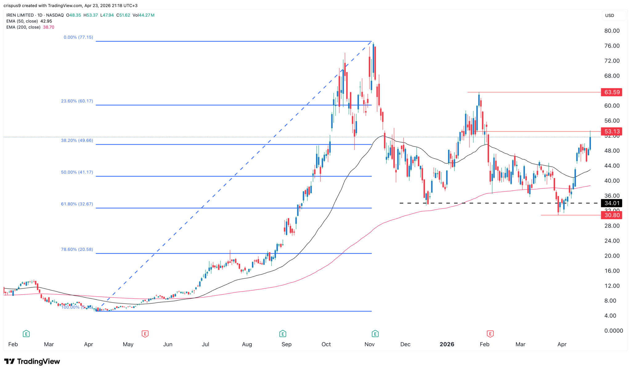 Der Tageschart zeigt, dass sich der IREN-Aktienkurs in den letzten Wochen erholt hat. Er hat sich von einem Tiefststand von 30 $ Anfang dieses Monats auf die aktuellen 51 $ erholt.
