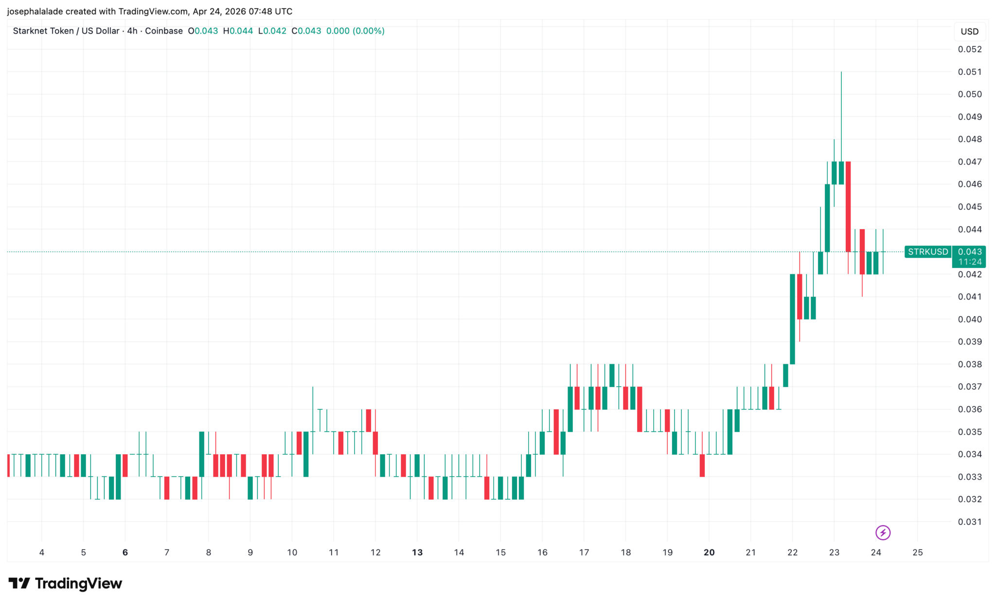 STRK konsolidierte sich etwa zwei Wochen lang zwischen 0,032 $ und 0,036 $ – ein Zeitraum, der das Allzeittief vom 15. April bei 0,03209 $ umfasste –, bevor eine impulsive Aufwärtsbewegung den Kurs am 21. und 22. April nach oben trieb.
