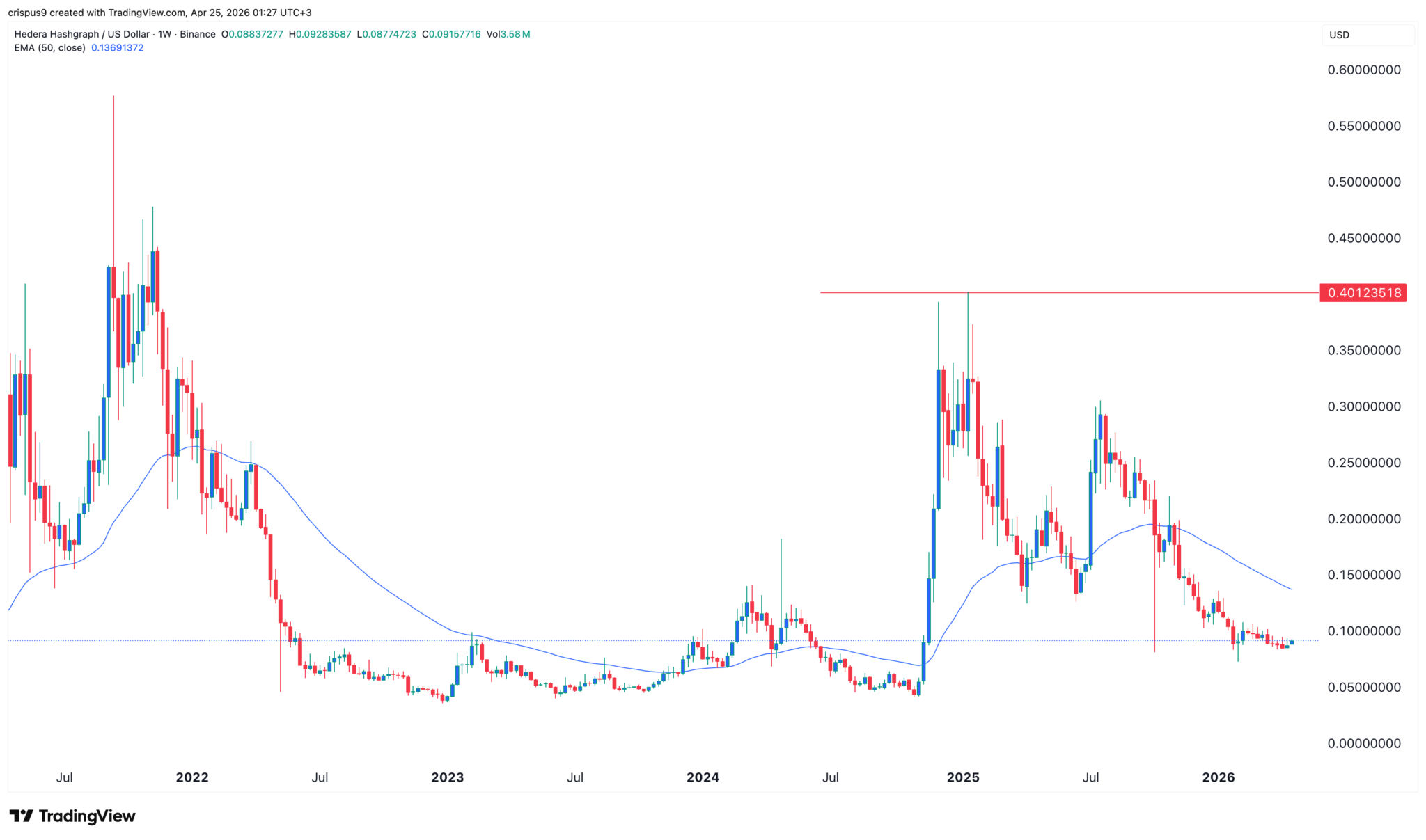 Hedera-Kurschart | Quelle: TradingView Der Wochen-Chart zeigt, dass der HBAR-Kurs in den letzten Monaten einen Abwärtstrend verzeichnet hat und von einem Höchststand von 0,4012 $ im Januar letzten Jahres auf heute 0,091 $ gefallen ist.