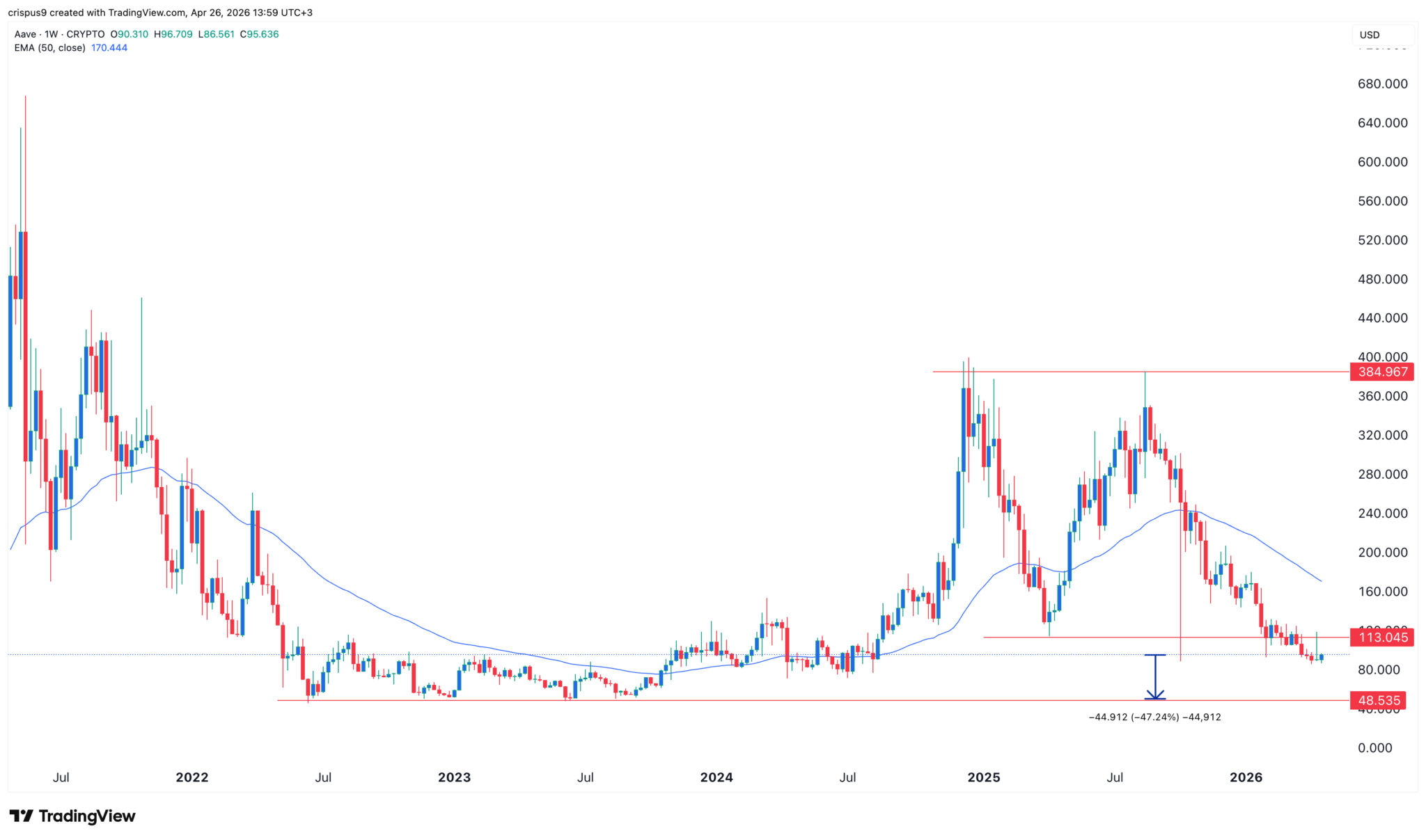 Der Wochen-Chart zeigt, dass der Aave-Kurs in den letzten Monaten unter Druck geraten ist. Er bildete ein Double-Top-Muster bei 384 $ und eine Nackenlinie bei 113,04 $, seinem Tiefststand am 7. April. Ein Double-Top ist eines der häufigsten Anzeichen für eine bärische Umkehr in der technischen Analyse.