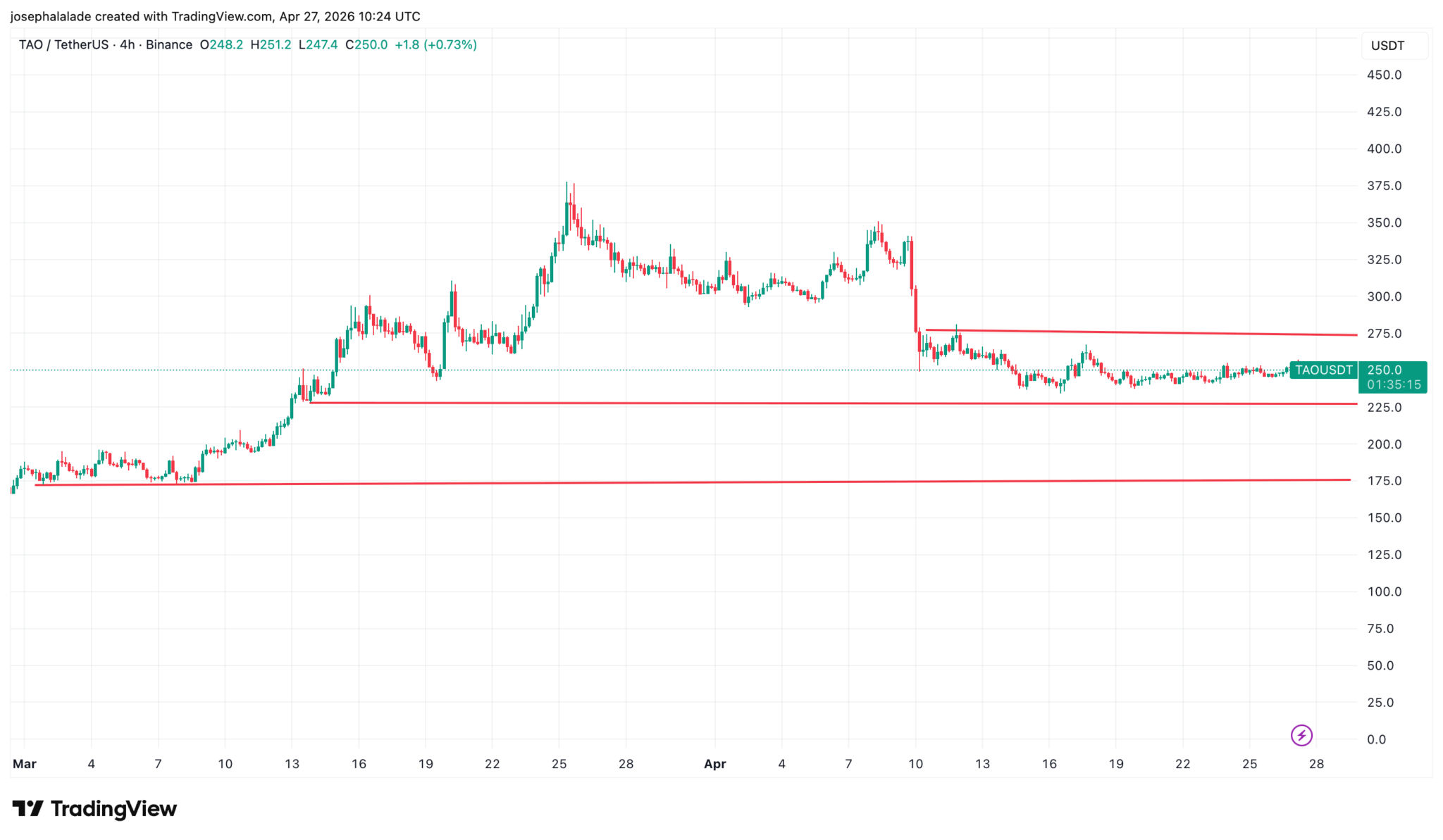 Das 4-Stunden-Chart zeigt eine Entwicklung, die sich noch nicht eindeutig in die eine oder andere Richtung geklärt hat. CyrilXBT hat diese Zone am 25. April markiert, da TAO bei 249 $ stand und dies den dritten Test einer wichtigen Unterstützung darstellte, die sowohl im Dezember als auch im Februar gehalten hat und beide Male zu starken Aufwärtsbewegungen führte.