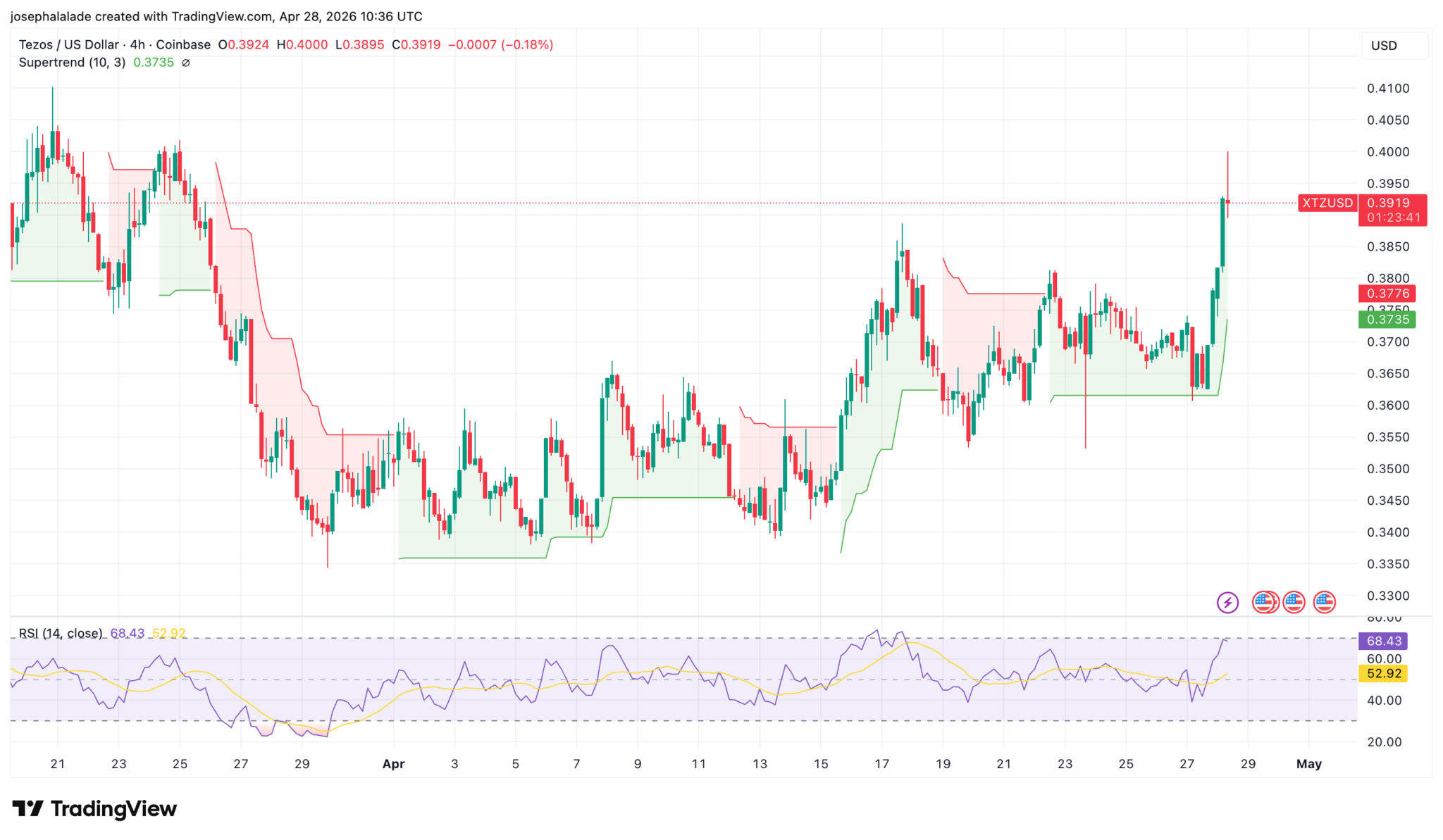 Auf dem 4-Stunden-Chart wechselte der Supertrend (10, 3) bei 0,373 $ von rot auf grün, und der Kurs beschleunigte von dort aus stark in die Widerstandszone von 0,395 $ bis 0,400 $, ein Niveau, das mit den Swing-Hochs von Ende März und Anfang April übereinstimmt. Die Struktur vor dieser Bewegung war bereits konstruktiv.